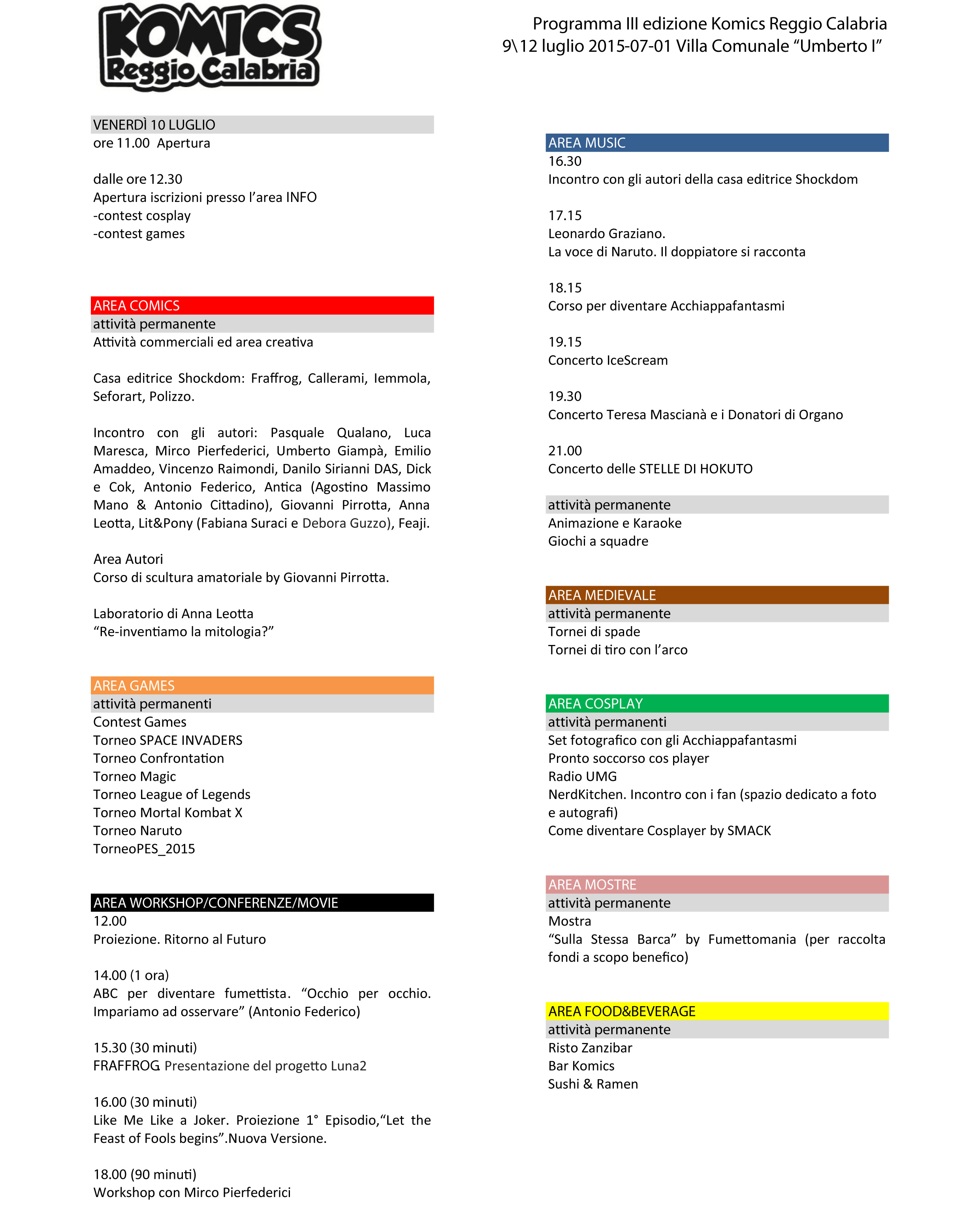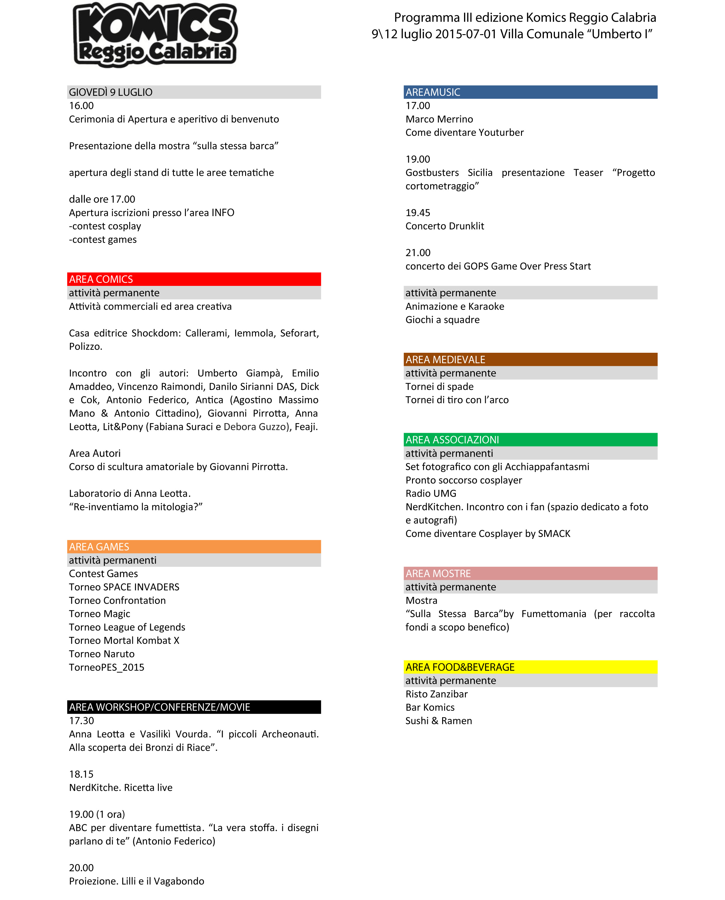 Situato nella Villa Comunale Umberto Primo, la manifestazione sarà divisa in aree tematiche, per tutti i gusti, con tornei di giochi, diverse gare e sfilate cosplay a tema, workshop e incontri, concerti serali. Ecco le aree tematiche: